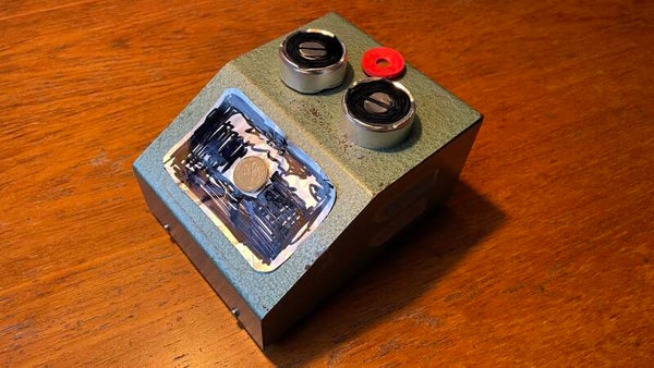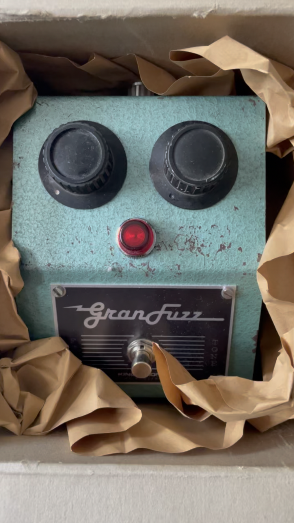 Our very first Fran Fuzz ever was built from an old model train transformer we bought at a flea market. That's how the idea came about. The knobs came from an old transmitter we bought on Marktplaats. The light bulb came from a peanut butter factory. The nameplates are etched onto aluminum, and the screws were scavenged from our sheds. In short, a composite device with vintage parts and a super-thick sound. You'll understand why we're keeping it and don't intend to sell it.